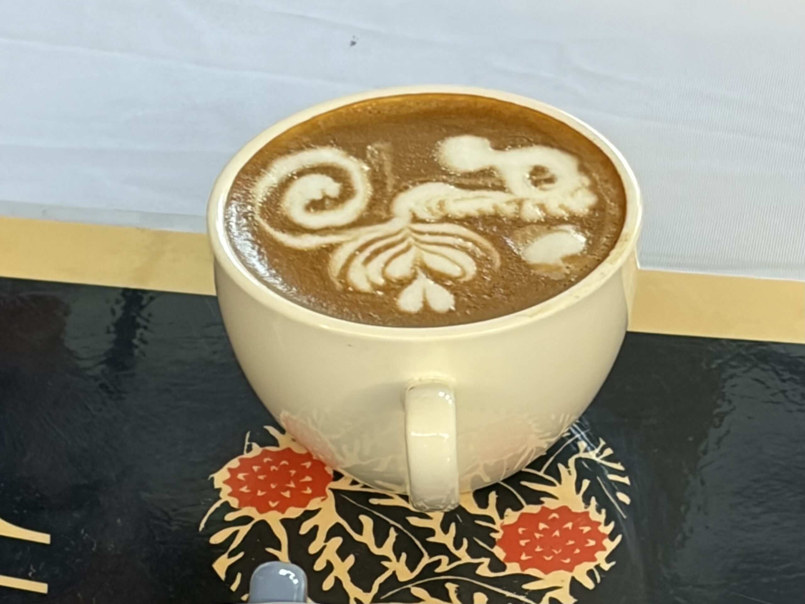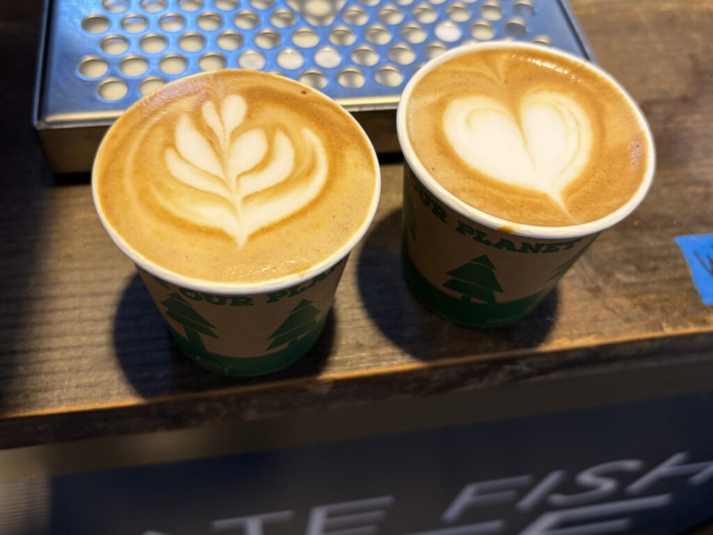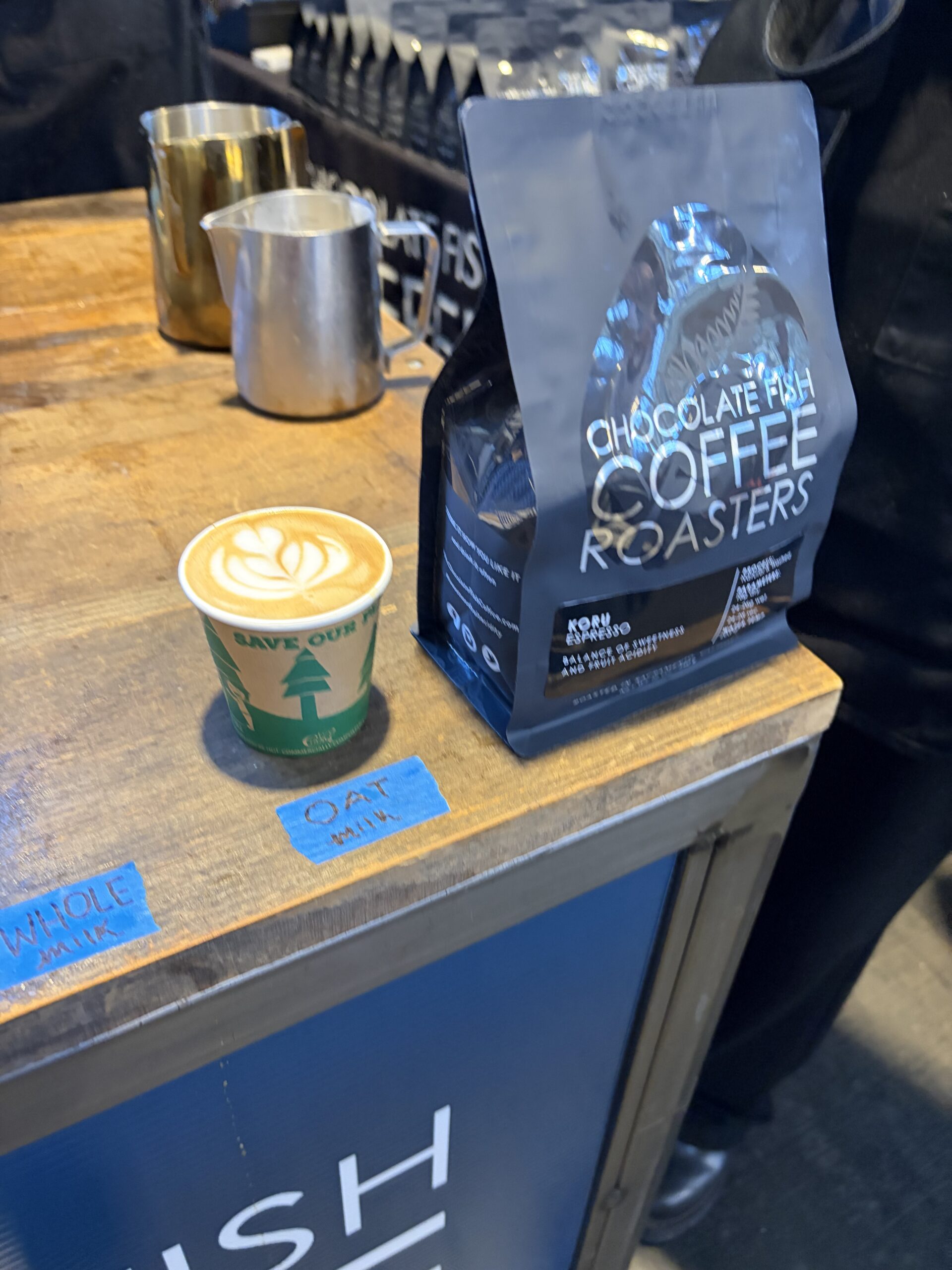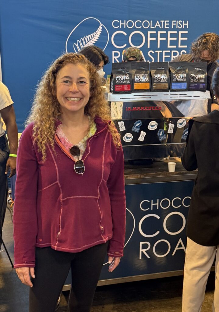 This is Raquel next to one of her favorite coffee roasters, Chocolate Fish Coffee Roasters, from Sacramento that served more traditional lattes.