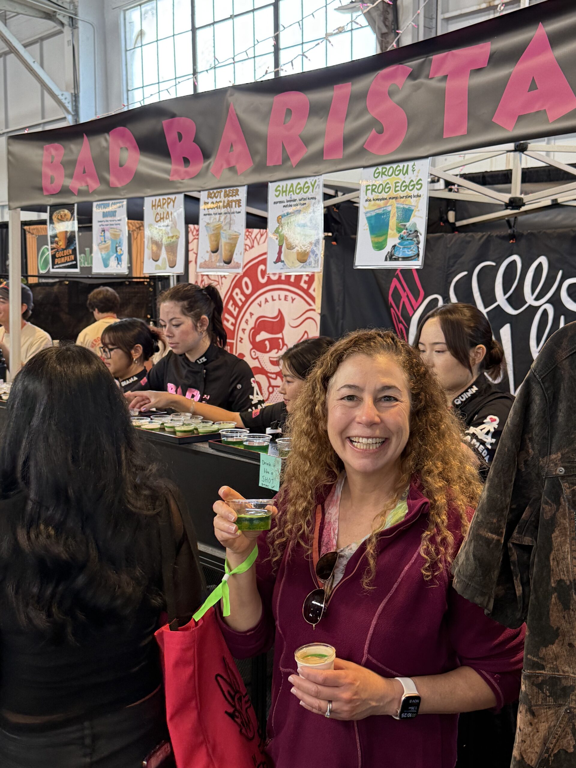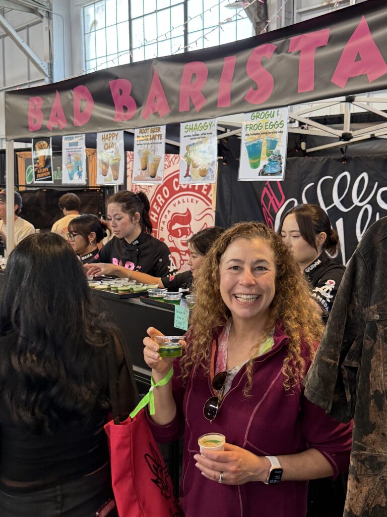 Coffee here, coffee there, coffee coffee everywhere at the San Francisco Coffee Festival in Fort Mason Festival Pavilion on Saturday Nov 8. One of Raquel’s favorites was the “Shaggy” from Bad Baristas, which made her eyes open wide with all the caffeine and sugar combo of an espresso, lavender, wild honey, and matcha cold foam (but avoid the “Grogu & Frog Eggs” – yuck)!
